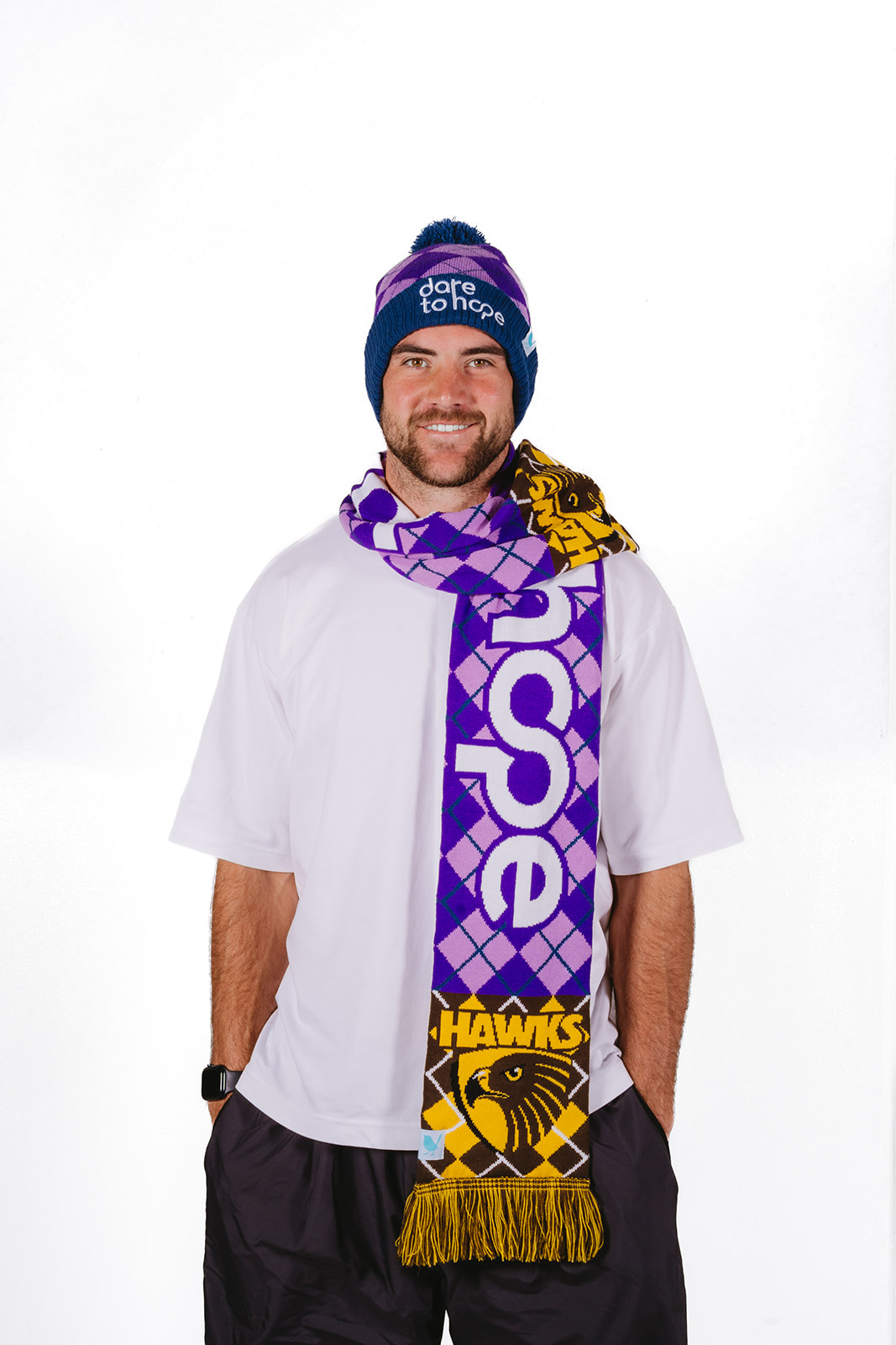 Featuring brown and gold alongside our signature purple message of hope, this exclusive scarf brings together team pride and a powerful cause. It’s the perfect way to show your colours at all Hawks games while supporting vital pancreatic cancer research.